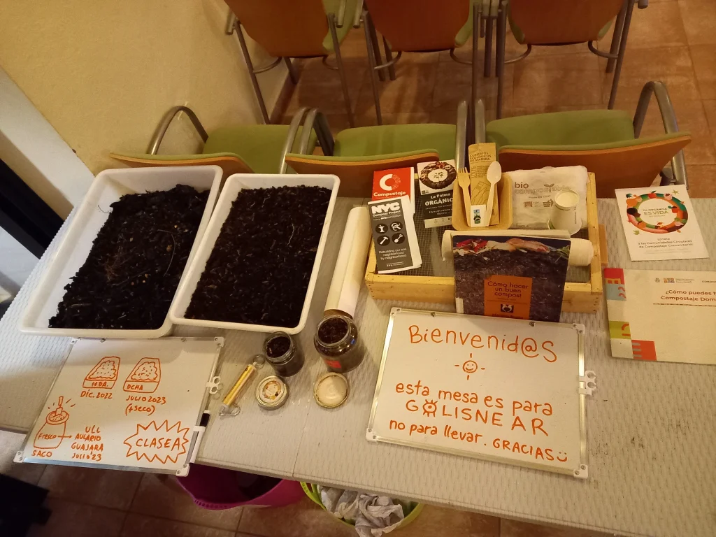 Esto, a su vez, nos ha abierto puertas en el ámbito formativo relacionado con esta materia, dándonos la posibilidad de participar en dos formaciones organizadas por la Universidad de La Laguna, dentro de sus cursos de extensión universitaria. Así, los días 24 de mayo y 13 de julio de 2023 fuimos las encargadas de desarrollar las sesiones de “Comunicación, educación ambiental y participación ciudadana en los procesos de compostaje comunitario”, ambas dentro del curso denominado “Prevención y gestión descentralizada de biorresiduos mediante compostaje doméstico y comunitario”.