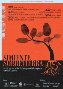 A inicios de este año, el Servicio de Patrimonio del Cabildo de Gran Canaria impulsaba la generación de unas jornadas de proyección del documental “Simiente Sobretierra: relatos y secuelas de la represión franquista en Gran Canaria”, pieza audiovisual creada por Violeta Gil Quintana y Teyra S.Coop. De esta manera desde la cooperativa recogimos la idea del servicio y propusimos, en base a tiempo y presupuesto: organizar cinco pases de proyección del documental “Simiente sobretierra” en Agaete, Gáldar, Telde, Las Palmas de GC y Arucas y facilitar el coloquio posterior. Con este formato se pretendían cuatro objetivos específicos:
